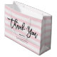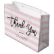 Esta moderna y elegante bolsa de compras en blanco y negro incluye las palabras "gracias" en la tipografía de escritura a mano, a la moda, sobre un fondo de banda de color rosa moda. Añada el nombre de su empresa o de su empresa, su sitio web u otra información para un bolso que sus clientes corporativos querrán mostrar.