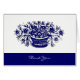 Tarjetas de agradecimiento personalizado con letras de guión opcionales en la parte frontal y en el arte vintage de las flores en una cesta azul sobre azul y blanco.
