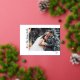 Relieve metalizado minimalista LWedding Gracias Photo Postcard presentando el guión "gracias" entre los corazones del Relieve metalizado abajo a la derecha y los nombres de sus parejas en escritura Relieve metalizado horizontalmente al final de la foto. Personalizable de nombres e información de retorno.