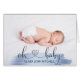 La fiesta de bienvenida al bebé moderna, original y linda del BEBÉ del OH, bebé asperja, recién nacido le agradece las tarjetas. Bebé de la caligrafía de la escritura "oh" con el falso movimiento azul del cepillo del efecto metalizado de oro y el corazón del diamante en centro. Añada el nombre (o la cancelación). Corrija el texto dentro para la nota especial. ¡Personalícelos con la imagen/la foto de su bebé!