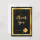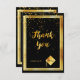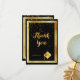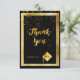 Una tarjeta de agradecimiento para el graduado. Un color de fondo negro y un marco dorado falso. Con una lluvia dorada de confeti. Delante, un guión con letras a mano y el texto: Gracias! Licenciado en 2022 y gorra con un límite de graduación.