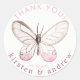 NewParkLane - Pegatinas favoritos de la boda simples pero elegantes, con una mariposa color rosa y beige, y ¡Gracias!, sus nombres y fecha boda en la sofisticada tipografía moderna. Fácil de personalizar en Zazzle con su propio texto para un diseño personalizado. Todos los estilos de texto, colores, tamaños se pueden modificar para adaptarlos a sus necesidades. Compruebe si hay elementos coincidentes. ¿Tienes deseos de diseño personal específicos? ¡Siéntete libre de contactarme!