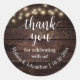 Gracias por celebrar con nosotros el Pegatina Boda, en caligrafía de escritura rústica, luces de cuerda de fiesta de cabaña, fondo de madera marrón oscura.