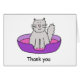Personalizado grisáceo y esponjoso gato, sonriendo y sentado en una canasta, con las palabras 'Gracias' debajo.