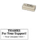 Este agradecido diseño de sellos de goma incluye el mensaje "¡GRACIAS por su apoyo!" y un nombre de empresa/empresa/organización de personalizable. Puede ser utilizado por una empresa, una empresa, un profesional o una organización para dar gracias a clientes o clientes que han realizado una compra.