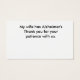 Tarjeta creada para cuidadores de personas con Alzheimer u otras formas de demencia. Es una manera discreta de alertar a otros (camarera, personal de servicio, etc.) de que la persona con la que estás está disminuida y que se requiere más paciencia. El texto de la parte posterior es totalmente personalizable a su situación o necesidades.