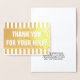 Este llamativo y audaz diseño de tarjetas de felicitación para Relieves metalizados dorados incluye el mensaje "¡GRACIAS POR TU AYUDA!" en el frente, junto con un mensaje de personalizable en el interior. Se podría usar para mostrar agradecimiento a alguien que ha asistido a un boda, un funeral, una graduación o algún otro evento.
