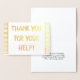 Este impresionante diseño de tarjetas de felicitación de Relieve metalizado dorado incluye el mensaje "GRACIAS POR TU AYUDA!" en el frente, junto con un mensaje personalizado en el interior. Se podría usar para mostrar agradecimiento a alguien que ha hecho un acto especial.