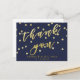 NewParkLane - Tarjeta postal elegante, con 'Gracias' en tipografía de falso oro con relieve en guion elegante, sobre un fondo azul marino con confeti dorado. Fácil de personalizar en Zazzle con tus propios nombres, fecha u otro texto para un diseño personalizado. Todo el estilo de texto, colores y tamaños se pueden modificar para adaptarse a tus necesidades. También puedes cambiar el color de fondo a cualquier color que prefieras.
