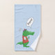 La toalla de mano de golfer hecha en azul claro con gráficos personalizados de un lagarto vestido de golf. El texto negro en la burbuja de la voz dice ¡Fore! y se puede personalizar para leer lo que quieras.