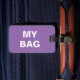 Graciosa etiqueta de equipaje morado con 'Mi bolsa' escrita en ella