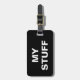 Graciosa etiqueta de equipaje negro y rojo con "Mis cosas" escritas en ella