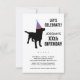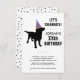 La invitación perfecta para la fiesta de cumpleaños de los amantes del perro con un perro negro de laboratorio usando un gorra festivo de fiestas - sólo agrega tus detalles para personalizar. Cambie fácilmente el color de fondo haciendo clic en personalizar y desplazándose hacia abajo hasta el selector de color. Funciona bien para los niños y las fiestas de cumpleaños de adultos.