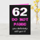 Esta graciosa tarjeta de cumpleaños número 62 es para mujeres. En la parte delantera aparece un gran 62 con las palabras: "¡NO TE PÁNICO, definitivamente aún lo tienes!". Dentro hay un giro divertido. Una gran carta para la dama con sentido del humor en su cumpleaños número 62. Derechos de autor Kathy Henis