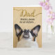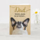 Este es un divertido diseño de tarjetas del Día del Padre que presenta un color, un acercamiento, imagen fotográfica de un perro tendido en su espalda, orejas arriba, ojos cerrados y portando una sonrisa realmente tonta. En la parte superior está el texto 'Dad' con un tipo de letra de efecto escrito a mano muy relajado y con un efecto brillante de oro creado digitalmente. Debajo está el texto: 'Shhhhhh, por favor no perturben...' El texto predeterminado dentro de la tarjeta dice '... ¡Estoy perfeccionando mi sonrisa FELIZ DEL DÍA DEL PADRE!', pero esto puede ser editado según sus propias preferencias. Tenga en cuenta que el efecto de brillo de oro se simula digitalmente dentro de la obra de arte, no se usará ningún purpurina real en la producción de esta tarjeta. Diseño de Natalie Kinnear