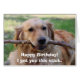 Humor de perro, tarjeta de feliz cumpleaños con un tonto recuperador de oro sosteniendo un palo, con una frase graciosa "¡Feliz cumpleaños! Te tengo este palo".