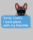 Esta graciosa sudadera frenchie presenta un lindo bulldog francés negro y marrón con un mensaje de texto que dice: "Lo siento, no puedo, tengo planes con mi francesa". Este lindo suéter también está disponible con diferentes bulldoges franceses de colores en diseños masculinos y femeninos.