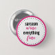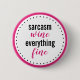 Botón gracioso para chicas "Sarcasmo, vino, todo bien". Negro y rosa caliente. Tipografía de moda.