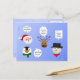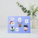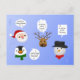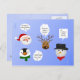 Santa Cláusula, reno, pingüino y snowman cantando la famosa canción: Te deseamos una Feliz Navidad. Ilustracion gracioso, lindo y humorístico para Navidades y Año Nuevo. Fondo azul con partitura de papel.