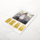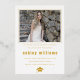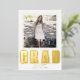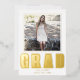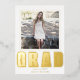 Presentamos una invitación de graduación contemporánea y sofisticada para la Clase de 2024, adornada con un toque de opulencia a través del uso de Relieve metalizado de oro moderno y elegante. Este exquisito diseño muestra la prominente inscripción "GRAD" en el brillante Relieve metalizado de oro, bellamente complementada con la cautivadora foto del graduado contra un inmaculado fondo blanco. Volviendo a la parte de atrás, una foto adicional honra la invitación, mientras también brinda una plataforma para incluir todos los detalles esenciales de esta memorable celebración de graduación.