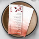 Eleva tu carta de menú boda con un impresionante fondo de gradiente de acuarela y un toque de estilo japonés. Este diseño combina sencillez y elegancia, con una línea vertical en el lado izquierdo que se extiende hacia la parte superior de la tarjeta, creando un efecto visualmente atractivo. La palabra "MENU" se ha incorporado inteligentemente en el diseño, añadiendo un toque moderno. El fondo del degradado de color agua, adornado con una bifurcación bien ilustrada y hojas de un estilo sencillo pero cautivador, muestra los tonos de terracota y rojo marrón, añadiendo calidez y sofisticación a la papelería boda. En la parte trasera de la tarjeta también hay el mismo degradado de color agua hipnotizante que garantiza un aspecto coherente y armonioso.