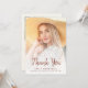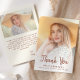 Tarjeta de agradecimiento para graduación moderna que incluye una foto vertical personalizado en la parte delantera y una foto horizontal al revés. Las palabras "Gracias" aparecen en la escritura terracota, con su nombre y año de graduación debajo en letra sans serif. Personalice el lado inverso con un mensaje de su elección en terracota sans serif en un fondo beige, y agregue su línea de firma en escritura a mano. Reemplace fácilmente las imágenes de ejemplo con sus propias fotos. Una pantalla de degradado blanco ayuda a asegurar que el texto de la parte delantera de la tarjeta aparezca. Ideal para graduación de secundaria o universitaria.