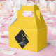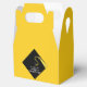 Una creativa fiesta de graduación favorece los regalos para tu clase superior de 25 grados con gorra negra de graduación y tassel de oro sobre fondo amarillo.