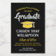 Añada un toque personalizado a la decoración de las fiestas de graduación de la universidad o de la escuela secundaria con estas elegantes etiquetas de minibotellas de vino en blanco, negro y oro. El diseño presenta un fondo negro, una tapa amarilla de la placa de mortero, una tipografía moderna y elegante, caligrafía de escritura a mano y un mensaje de personalizable que dice "Felicitaciones a nuestro graduado". El texto inferior incluye el año de clase, el nombre de la escuela y las líneas opcionales para el grado, el tipo de bebida u otra información. Todo el texto es sencillo para el personalizar. Estas etiquetas hacen una elegante idea de beber de una fiesta de graduación y una elegante adición a la celebración del día especial del graduado. Salud!