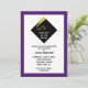 La graduación creativa invita a presentar el patrón clásico de diseño de capucha negra y tacón dorado sobre fondo morado.