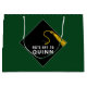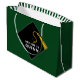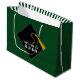 Bolsa de regalo de graduación con una tapa clásica en negro y oro sobre un fondo verde. Editar texto para agregar el nombre del grado superior.