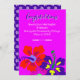 Unique and colorful graduation announcement with hibiscus flowers art. Tropical, hot pink color with dark purple, and off-white text. Three hibiscus flowers make a wide border at the bottom.. Fill in the templates to announce a daughter's graduation from high school or college. The reverse contains a pattern of graduation caps.