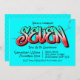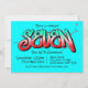 Una desordenada y brillante invitación azul neón para un niño de siete años.