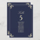 Elegante gráfico de asientos barroco azul marino y boda dorado con flores de época ornamentadas, tipografía sofisticada y una disposición formal para guiar a los huéspedes hacia sus mesas. Perfecto para bodas de lujo, este cuadro de asientos está totalmente personalizable con nombres de invitados, asignaciones de mesas y detalles de su boda. Un diseño atemporal y distinguido que combina con toda una suite boda de la marina barroca, añadiendo refinamiento a la decoración de la recepción.