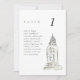 Cartas de cartas con números de mesa de boda de moda que incluyen una pintura acuarela del edificio Chrysler de la ciudad de Nueva York. El emparejamiento de la acuarela de la pintoresca y la tipografía de la moda es una combinación muy divertida.