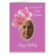 Una tarjeta de cumpleaños para una bisabuela. Las orquídeas simbolizan el amor, el lujo y la fuerza, cualidades que reflejan la belleza de su espíritu. En su cumpleaños, desearía que su día fuera tan exquisito e inolvidable como estos florecimiento. Añade su foto para crear una tarjeta única especialmente para ella.