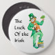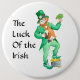 Un gran botón blanco decorado con un leprechaun y las palabras "La suerte del irlandés".