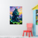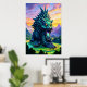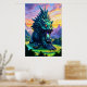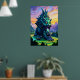 Una gran criatura de fantasía azul con cuatro patas, cola, piel verde y muchos dientes afilados en la boca, bosque y montaña en el fondo con un cielo colorido. Este es un arte generado por IA.