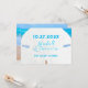 Guarda las tarjetas de fecha con un diseño de grandes dólares de arena. Una simple invitación boda con tres líneas de texto azul tropical sobre una imagen realista de un dólar de arena blanca. La imagen oceánica de fondo se muestra a través del agujero de cerradura y los agujeros del dólar y alrededor de los bordes en la parte superior. El texto coincide con los colores turquesa y azul del agua. Personalizar tres líneas con fecha, nombre y ubicación. El panorama completo de la playa está impreso en la parte trasera. Una forma sencilla, bonita y eficaz de pedir a los clientes que guarden su fecha de boda.