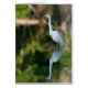 Una Gran Egreda Blanca de pie en un río poco profundo acosando a un pez. El reflejo del pájaro se ve en las aún tranquilas aguas.
