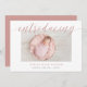 Los modernos y elegantes anuncios de nacimiento presentan su foto favorita horizontal o paisajista orientada al neonato con "introducción" en la parte superior en polvorientas letras de caligrafía rosa. El nombre del bebé y las estadísticas de nacimiento aparecen debajo. Agregue seis fotos adicionales a la parte posterior en un diseño de collage o elimine para dejar en blanco.