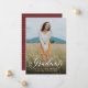 Esta simple y clásica invitación de graduación presenta una gran foto vertical y la palabra "graduado" en escritura. El respaldo de la coordinación se puede personalizar con la elección de un color escolar o favorito (haga clic en el botón "personalizar", seleccione "atrás" y luego "seleccione un color de fondo").