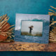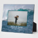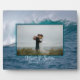 Regalo fotográfico para recién casados. Marco fotográfico de pie con fondo de olas grandes. Tamaño 8x10, placa horizontal con caballete y plantilla de foto con texto. Usar una imagen horizontal/horizontal de la pareja que será enmarcada por líneas azules. Olas oceánicas y agua azul son el fondo de un texto sin blanco. Incluir los nombres de la pareja en guión lujoso con la fecha del evento impresa debajo. La foto será impresa en la placa para preservar los recuerdos del día especial. Hace un buen regalo de mantenimiento para cualquier pareja.