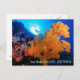 Una postal con uno de los corales suaves de colores vivos que se encuentra en la Gran Barrera de Coral de Australia. Un buceador se encuentra en medio del sol.
