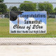 Fondo azul del cielo con gorra de mortero negra y tassel. Cartel personalizado de la fiesta de graduación al aire libre o cubierta con el año de graduación, nombre, escuela secundaria. Espectacular manera de felicitar al graduado y dar la bienvenida a la familia y a los invitados a su fiesta de graduación.