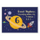 ¡Cumplir 6 años es algo fuera de este mundo, especialmente cuando es tu gran sobrino! Un barco con cohetes, planetas y estrellas llenan la parte delantera de la tarjeta con el mensaje mientras se cuenta para decir ¡Feliz Cumpleaños!