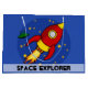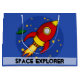 Ilustracion de un lindo cohete en el espacio exterior, rodeado de estrellas, y una pequeña nave espacial verde OVNI. Perfecto para niños o adultos amantes de la diversión. En: