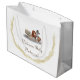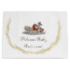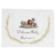 El diseño temático "Animales rellenos" incluye la imagen de animales adorables rellenos reunidos para dar la bienvenida al bebé. Su mensaje personal se muestra debajo de la imagen en una fuente decorativa marrón dorado. Diseñado para acompañar las invitaciones y accesorios de la ducha de peluche con peluche.