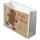 Un chico grande de pan de jengibre decora esta bolsa de regalo de vacaciones. El diseño es de arte original.