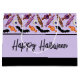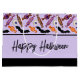 Un delicioso diseño de bolsos de regalo de Halloween que incluye ilustraciones de varios dulces de Halloween incluyendo gombas de béisbol, murciélagos de goma y dulces duros a rayas rápidas en colores naranja, morado y negro. El texto predeterminado dice "Hallowee feliz", texto personalizar para personalizar.
