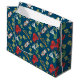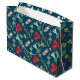 Una bolsa grande de regalos de moda, con un patrón de Emblemas galeses, un chica con ropa tradicional de welsh, un dragón rojo, un montón de puerros, un arpa y un montón de daffodils. Si lo deseas, puedes cambiar fácilmente el color de fondo azul.